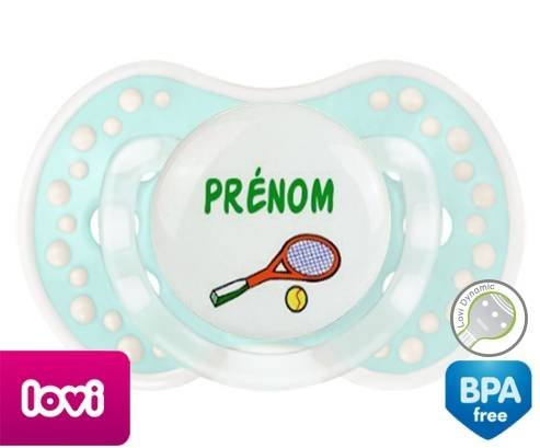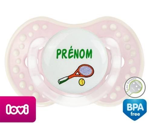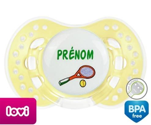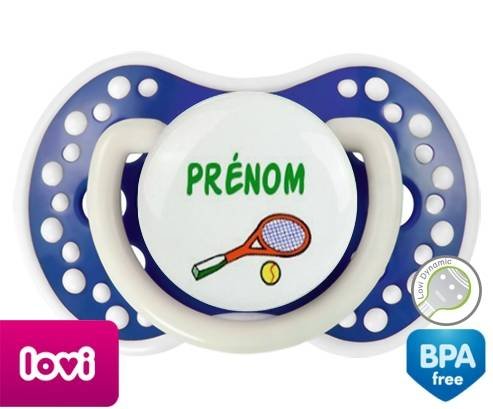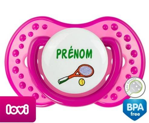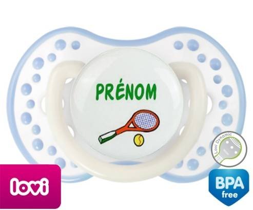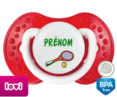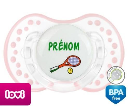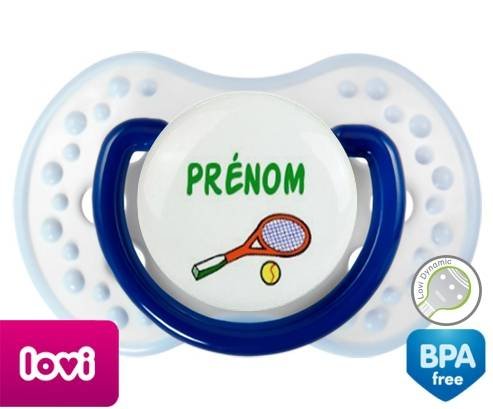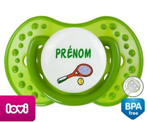 Tétine personnalisée pour bébé Tennis + prénom à embout LOVI Dynamic en silicone de la marque Lovi Dynamic avec impression en en Couleurs de la collection Prénom personnalisé.La silicone se reconnaît par sa couleur transparente. C'est une matière souple, douce, sans goût ni odeur et offre à bébé une succion plus facile grâce à sa souplesse.
