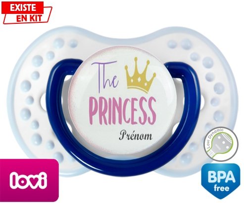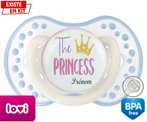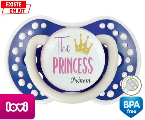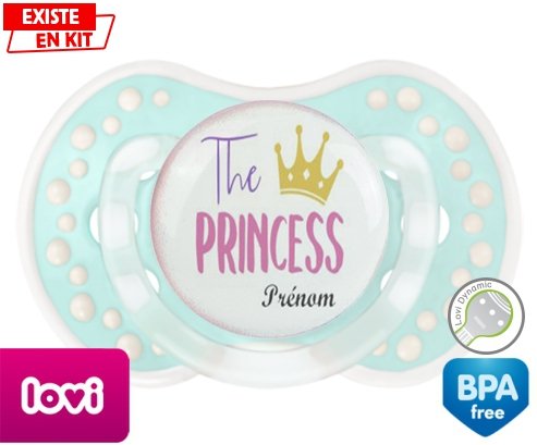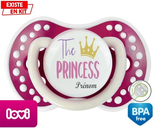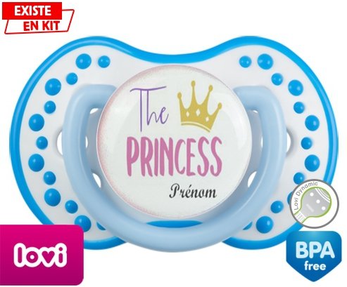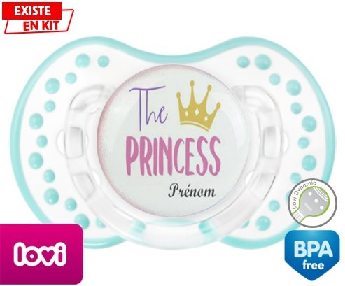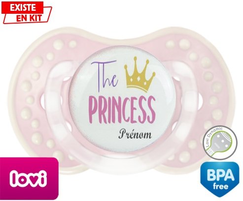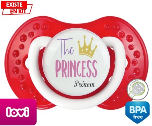 Sucette personnalisée pour bébé The princess + prénom à embout LOVI Dynamic en silicone de la marque Lovi Dynamic avec impression en en Couleurs de la collection Prénom personnalisé.La silicone se reconnaît par sa couleur transparente. C'est une matière souple, douce, sans goût ni odeur et offre à bébé une succion plus facile grâce à sa souplesse.