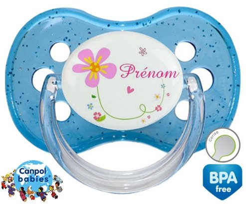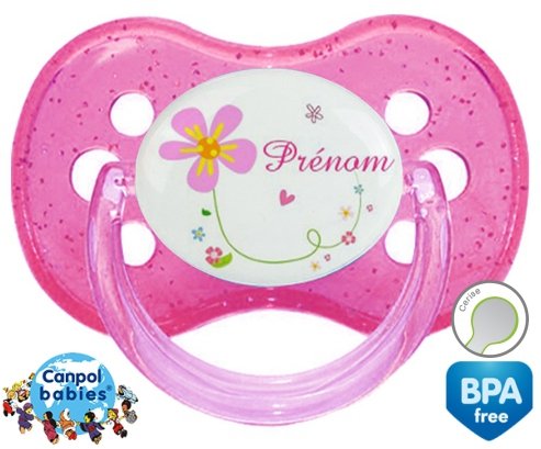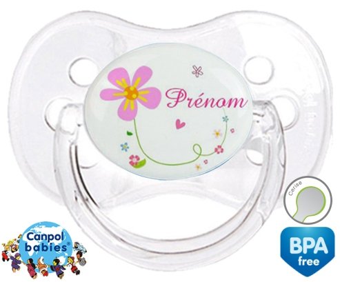 Sucette personnalisée pour bébé Tige et fleur + prénom à embout Cerise en silicone de la marque Canpol Babies avec impression en en Couleurs de la collection Prénom personnalisé.La silicone se reconnaît par sa couleur transparente. C'est une matière souple, douce, sans goût ni odeur et offre à bébé une succion plus facile grâce à sa souplesse.
