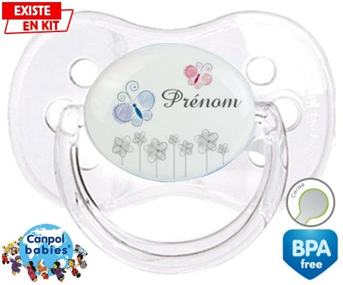 Sucette personnalisée pour bébé Tige fleur grise + prénom à embout Cerise en silicone de la marque Canpol Babies avec impression en en Couleurs de la collection Prénom personnalisé.La silicone se reconnaît par sa couleur transparente. C'est une matière souple, douce, sans goût ni odeur et offre à bébé une succion plus facile grâce à sa souplesse.