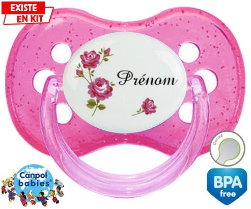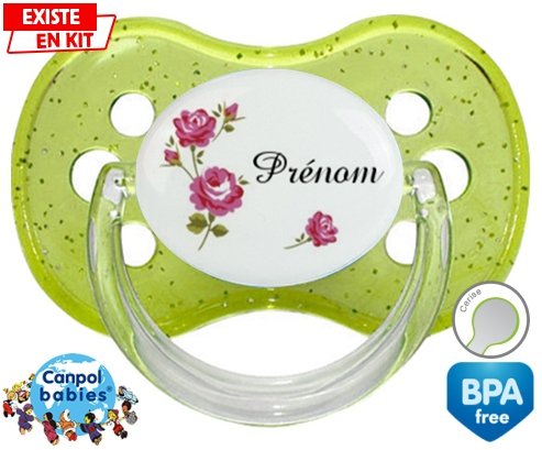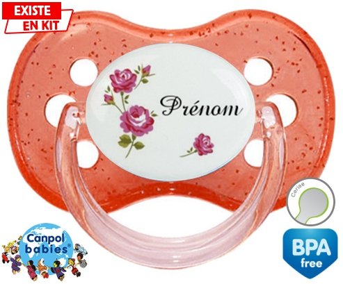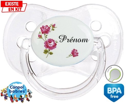 Sucette personnalisée pour bébé Tige fleur + prénom à embout Cerise en silicone de la marque Canpol Babies avec impression en en Couleurs de la collection Prénom personnalisé.La silicone se reconnaît par sa couleur transparente. C'est une matière souple, douce, sans goût ni odeur et offre à bébé une succion plus facile grâce à sa souplesse.