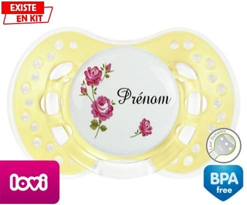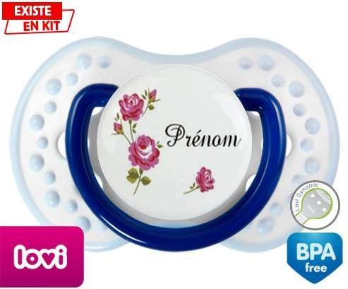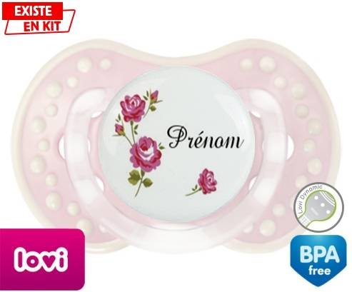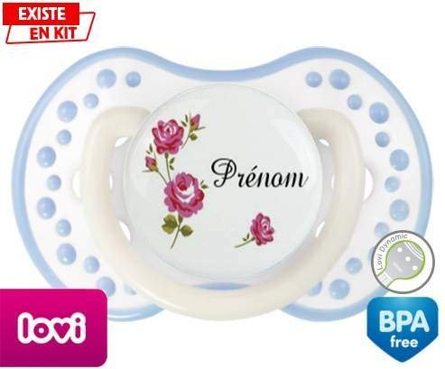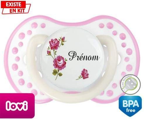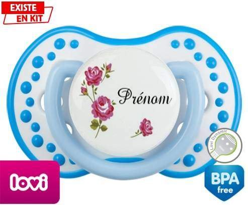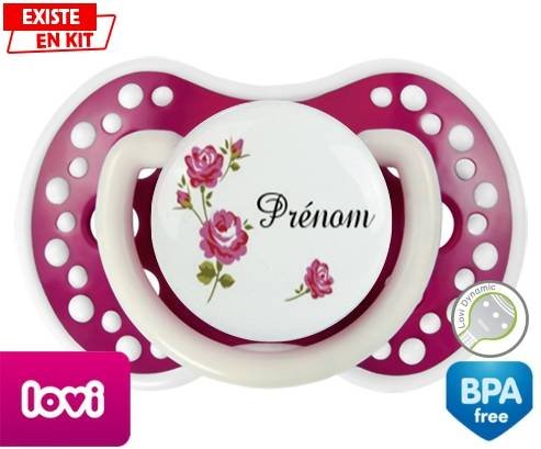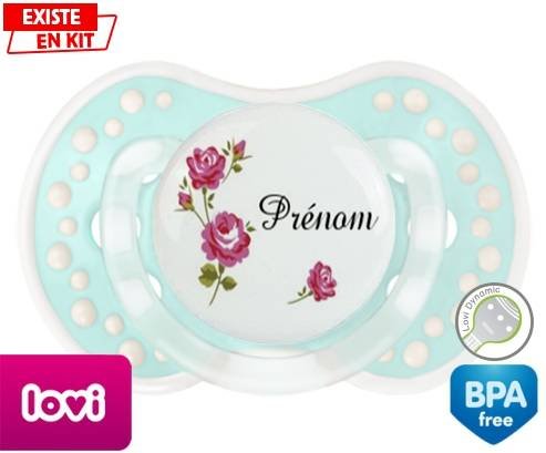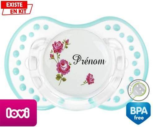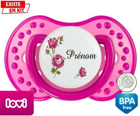 Sucette personnalisée pour bébé Tige fleur + prénom à embout LOVI Dynamic en silicone de la marque Lovi Dynamic avec impression en en Couleurs de la collection Prénom personnalisé.La silicone se reconnaît par sa couleur transparente. C'est une matière souple, douce, sans goût ni odeur et offre à bébé une succion plus facile grâce à sa souplesse.