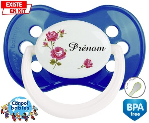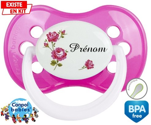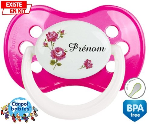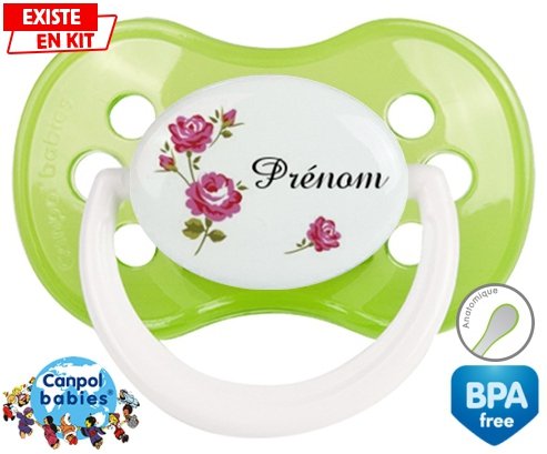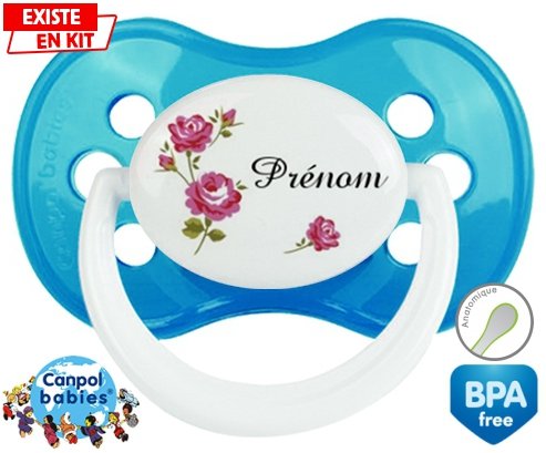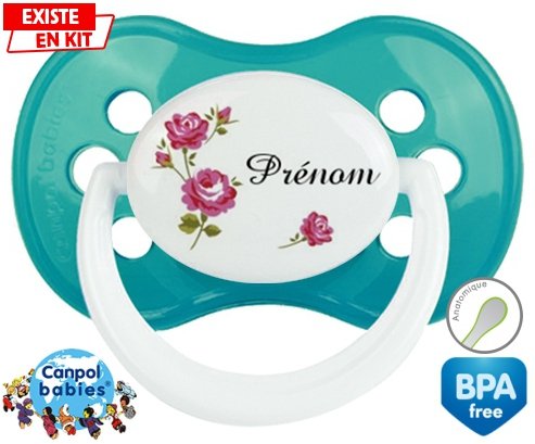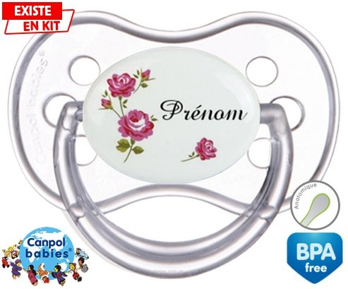 Tétine personnalisée pour bébé Tige fleur + prénom à embout Anatomique en silicone de la marque Canpol Babies avec impression en en Couleurs de la collection Prénom personnalisé.La silicone se reconnaît par sa couleur transparente. C'est une matière souple, douce, sans goût ni odeur et offre à bébé une succion plus facile grâce à sa souplesse.