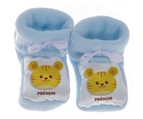 Su7.fr vous propose le chausson bébé personnalisé pour nouveau né avec le design : Tigre style 3 + prénom . Ce chausson avec une impression en couleur compléte toute la gamme ( sucette, attache-sucette, bavoir, chausson, body , Boîte à sucette, et bonnet).