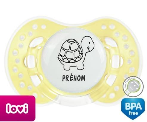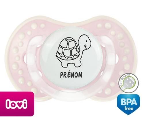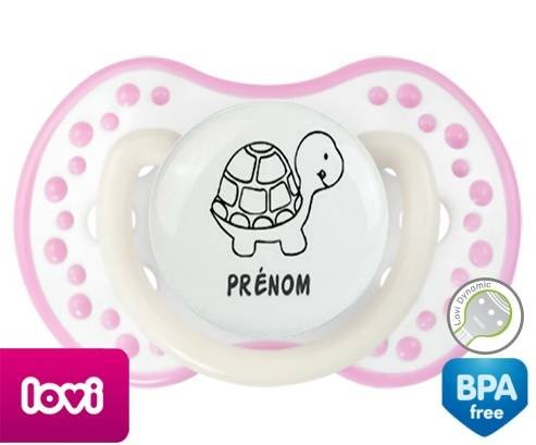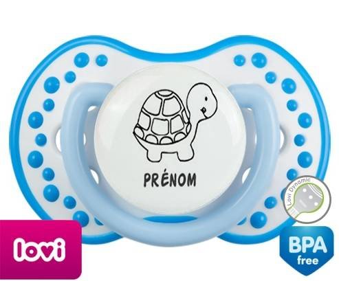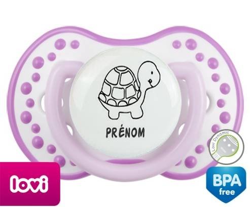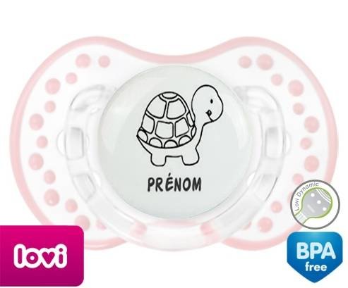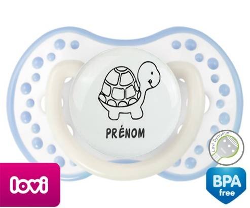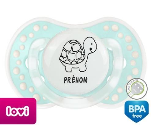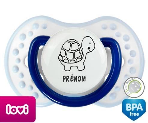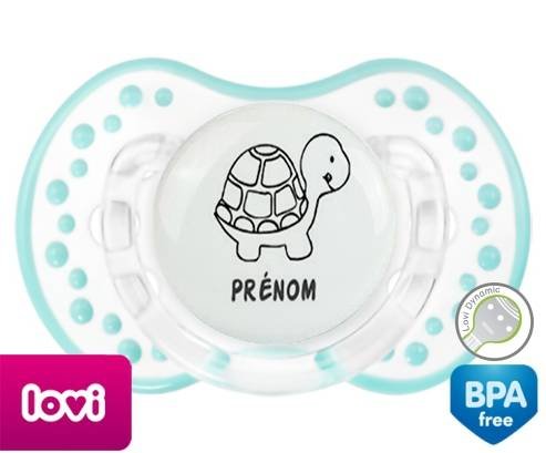 Tetine personnalisee pour bébé Tortue style1 + prénom à embout LOVI Dynamic en silicone de la marque Lovi Dynamic avec impression en en Gris de la collection Prénom personnalisé.La silicone se reconnaît par sa couleur transparente. C'est une matière souple, douce, sans goût ni odeur et offre à bébé une succion plus facile grâce à sa souplesse.