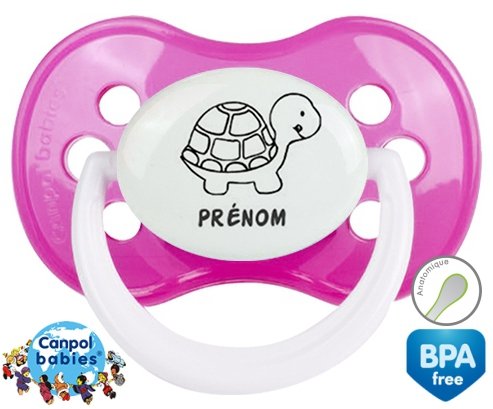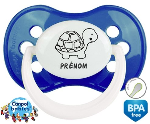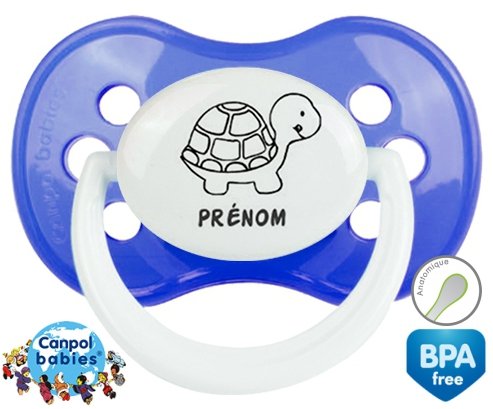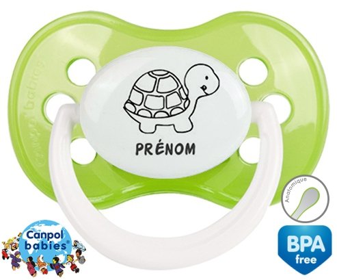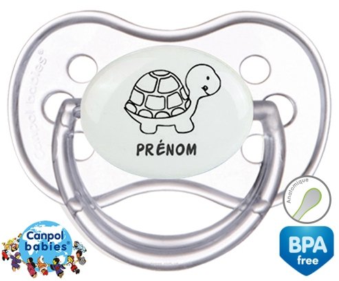 Tétine personnalisée pour bébé Tortue style1 + prénom à embout Anatomique en silicone de la marque Canpol Babies avec impression en en Gris de la collection Prénom personnalisé.La silicone se reconnaît par sa couleur transparente. C'est une matière souple, douce, sans goût ni odeur et offre à bébé une succion plus facile grâce à sa souplesse.