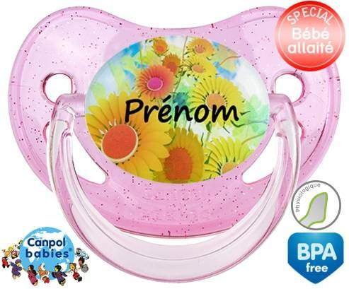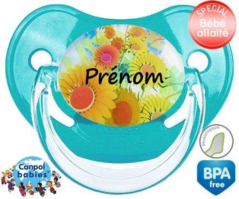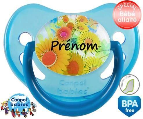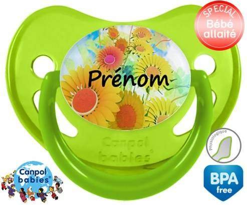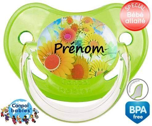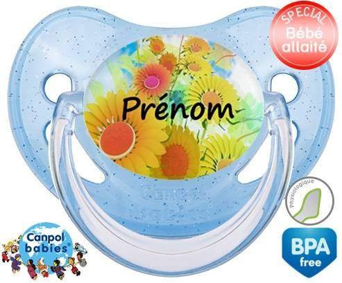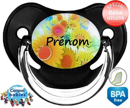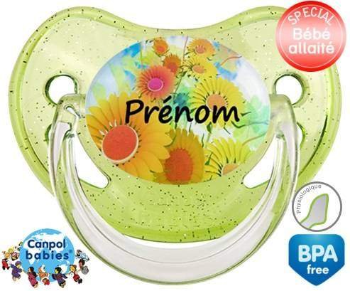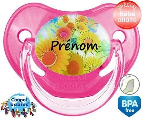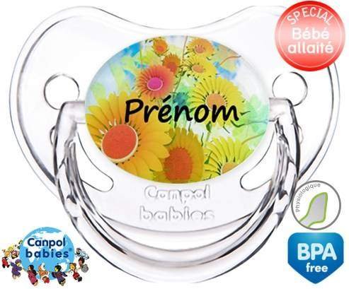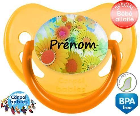 Sucette personnalisée pour bébé Tournesol + prénom à embout Physiologique en silicone de la marque Canpol Babies avec impression en en Couleurs de la collection Prénom personnalisé.La silicone se reconnaît par sa couleur transparente. C'est une matière souple, douce, sans goût ni odeur et offre à bébé une succion plus facile grâce à sa souplesse.