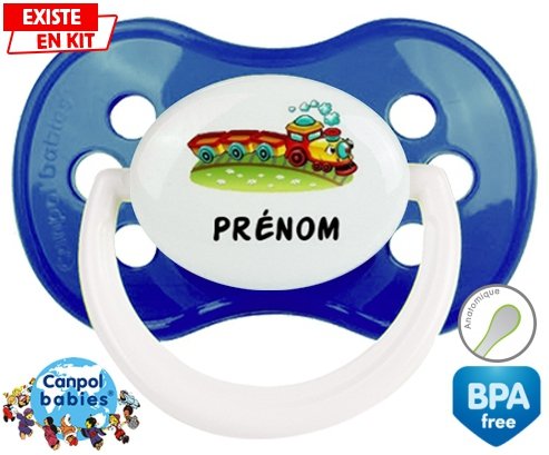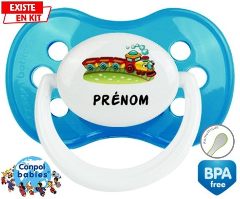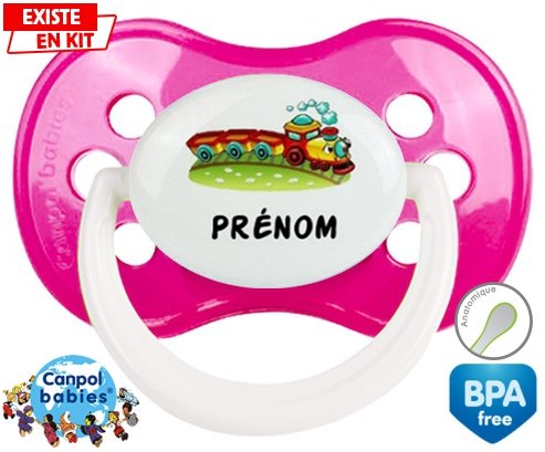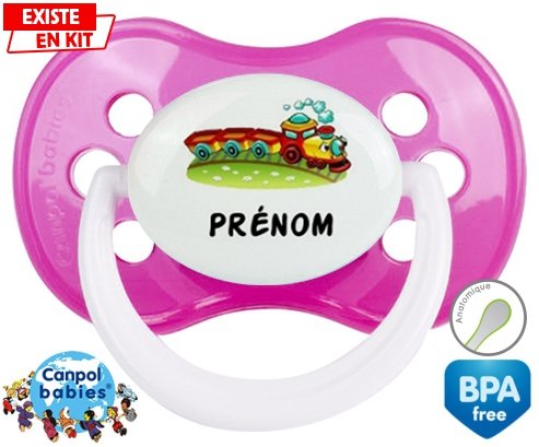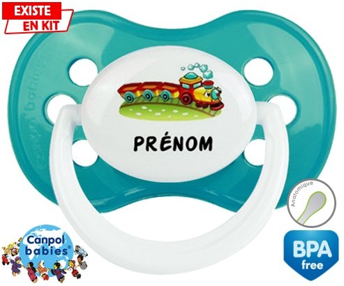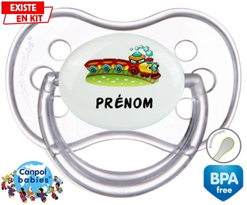 Sucette personnalisée pour bébé Train + prénom à embout Anatomique en silicone de la marque Canpol Babies avec impression en en Couleurs de la collection Prénom personnalisé.La silicone se reconnaît par sa couleur transparente. C'est une matière souple, douce, sans goût ni odeur et offre à bébé une succion plus facile grâce à sa souplesse.
