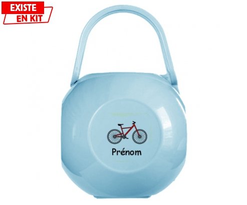 Boîte à sucette personnalisée : Vélo + prénom , avec une impression en couleur et qui compléte toute la gamme ( sucette, attache-sucette, bavoir, chausson, body et bonnet).
