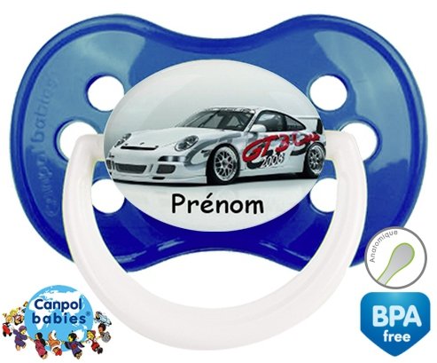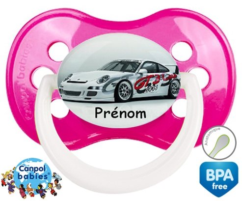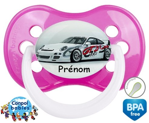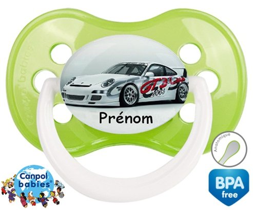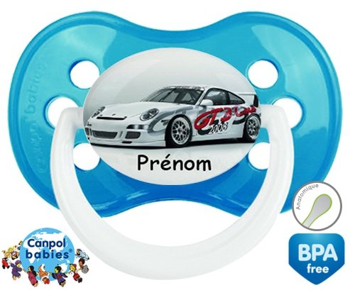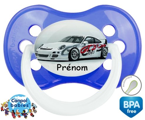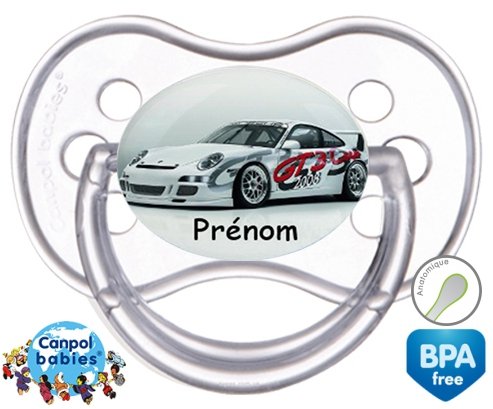 Sucette personnalisée pour bébé Voiture de course + prénom à embout Anatomique en silicone de la marque Canpol Babies avec impression en en Couleurs de la collection Prénom personnalisé.La silicone se reconnaît par sa couleur transparente. C'est une matière souple, douce, sans goût ni odeur et offre à bébé une succion plus facile grâce à sa souplesse.