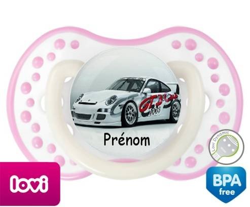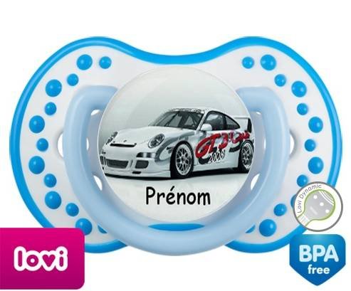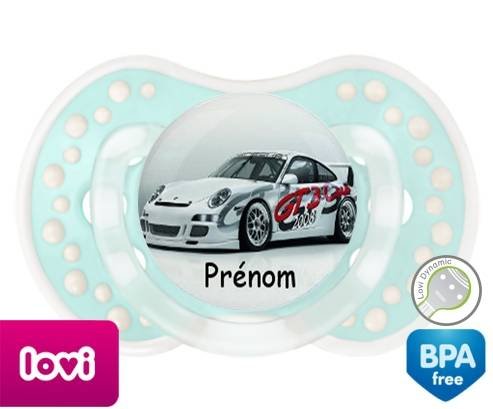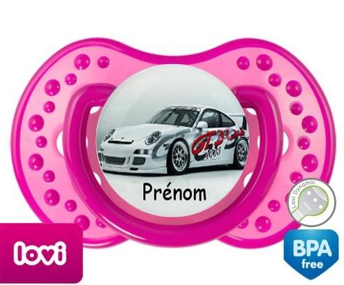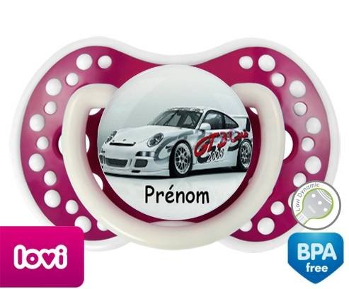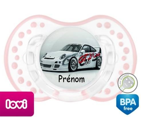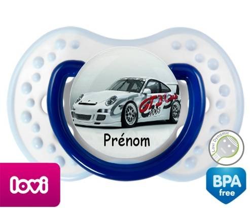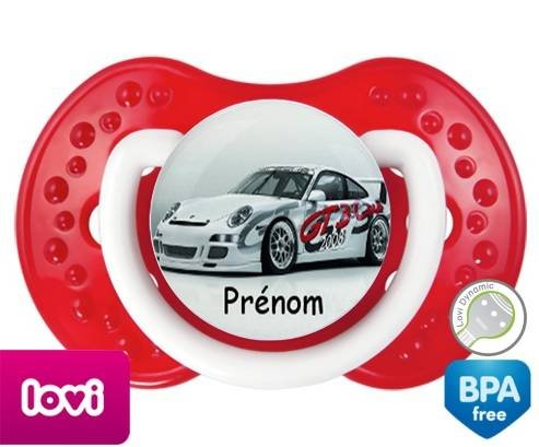 Sucette personnalisée pour bébé Voiture de course + prénom à embout LOVI Dynamic en silicone de la marque Lovi Dynamic avec impression en en Couleurs de la collection Prénom personnalisé.La silicone se reconnaît par sa couleur transparente. C'est une matière souple, douce, sans goût ni odeur et offre à bébé une succion plus facile grâce à sa souplesse.