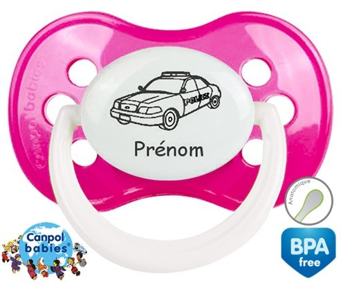 Sucette personnalisée avec le prénom pour bébé Voiture police + prénom : Sucette Anatomique en silicone de la marque Canpol Babies avec impression en Gris.