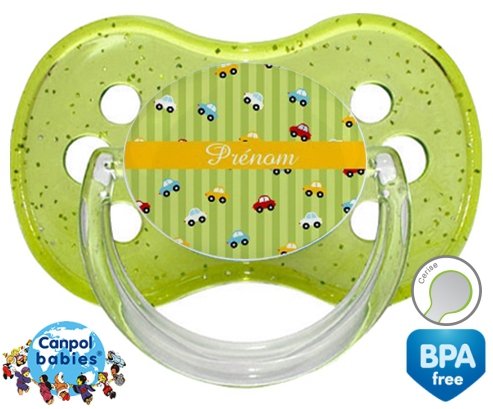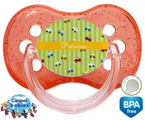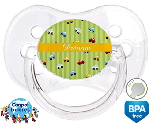 Tetine personnalisee pour bébé Voiture + prénom à embout Cerise en silicone de la marque Canpol Babies avec impression en en Couleurs de la collection Prénom personnalisé.La silicone se reconnaît par sa couleur transparente. C'est une matière souple, douce, sans goût ni odeur et offre à bébé une succion plus facile grâce à sa souplesse.