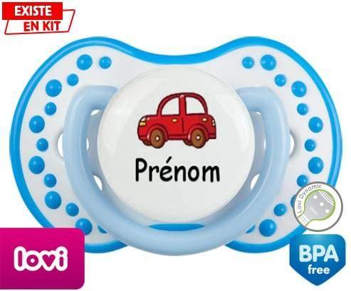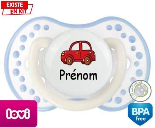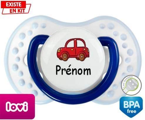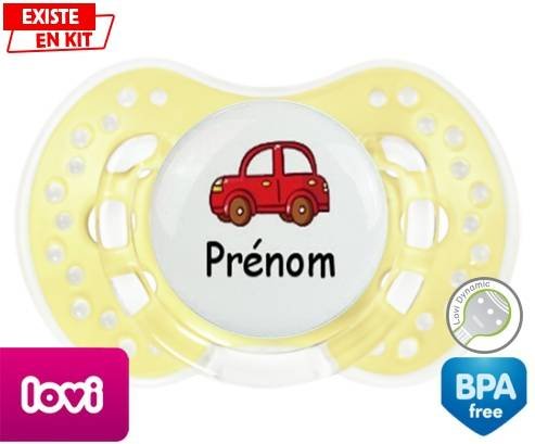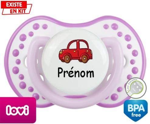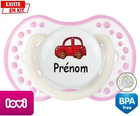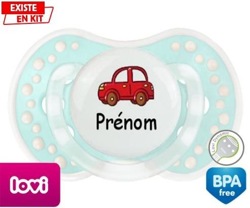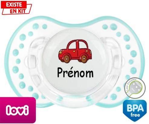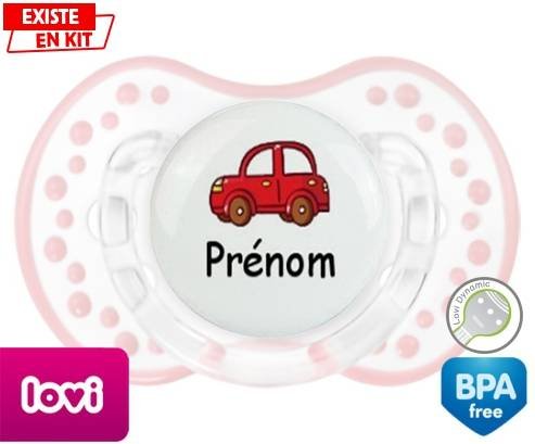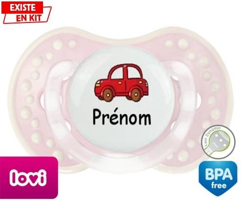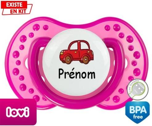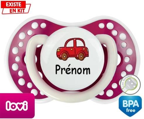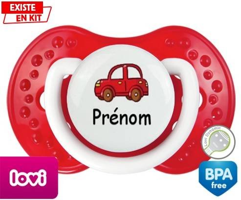 Tetine personnalisee pour bébé Voiture rouge + prénom à embout LOVI Dynamic en silicone de la marque Lovi Dynamic avec impression en en Couleurs de la collection Prénom personnalisé.La silicone se reconnaît par sa couleur transparente. C'est une matière souple, douce, sans goût ni odeur et offre à bébé une succion plus facile grâce à sa souplesse.