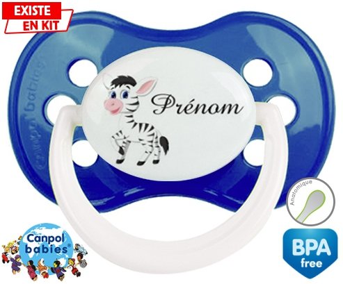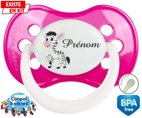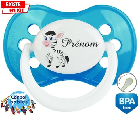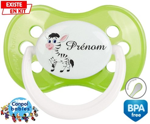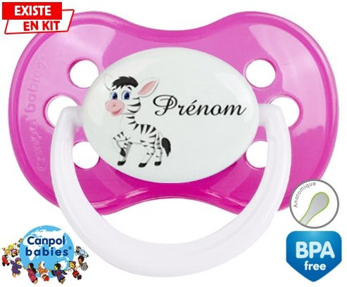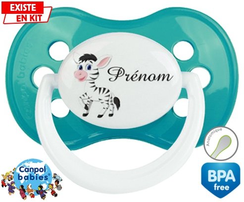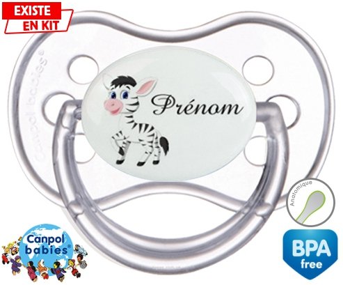 Tetine personnalisee pour bébé Zèbre style1 + prénom à embout Anatomique en silicone de la marque Canpol Babies avec impression en en Couleurs de la collection Prénom personnalisé.La silicone se reconnaît par sa couleur transparente. C'est une matière souple, douce, sans goût ni odeur et offre à bébé une succion plus facile grâce à sa souplesse.