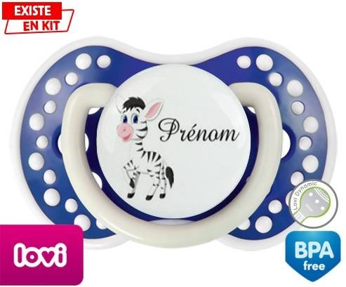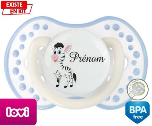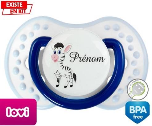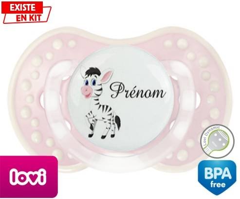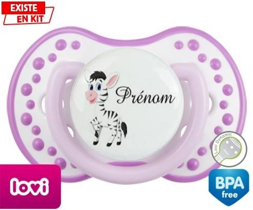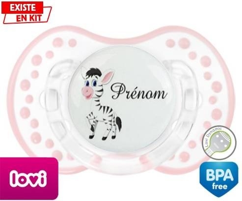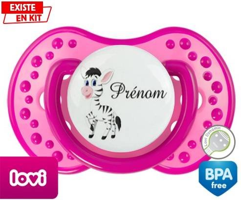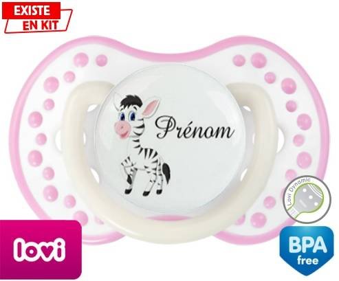 Sucette personnalisée pour bébé Zèbre style1 + prénom à embout LOVI Dynamic en silicone de la marque Lovi Dynamic avec impression en en Couleurs de la collection Prénom personnalisé.La silicone se reconnaît par sa couleur transparente. C'est une matière souple, douce, sans goût ni odeur et offre à bébé une succion plus facile grâce à sa souplesse.