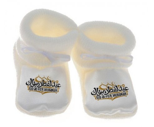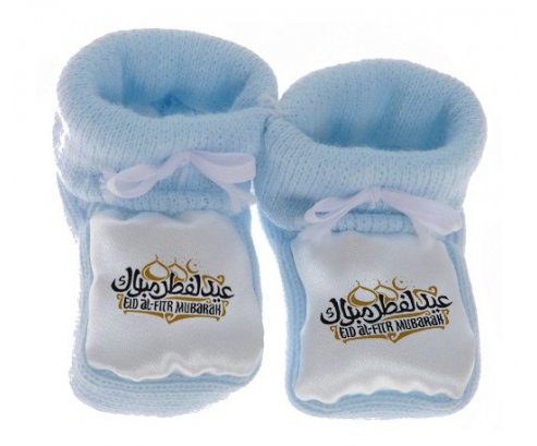 Su7.fr vous propose le chausson bébé personnalisé pour nouveau né avec le design : Islam eid fitr moubarek . Ce chausson avec une impression en couleur compléte toute la gamme ( sucette, attache-sucette, bavoir, chausson, body , Boîte à sucette, et bonnet).