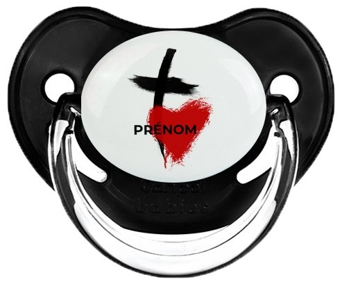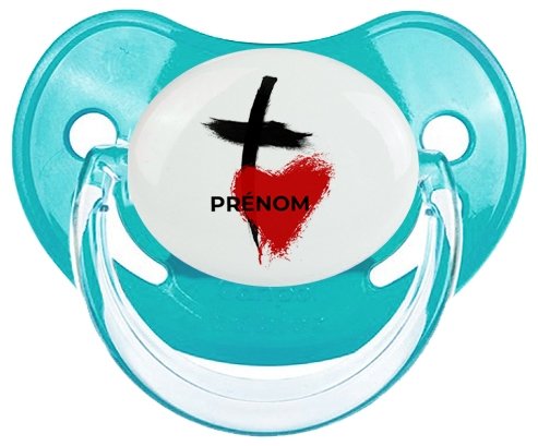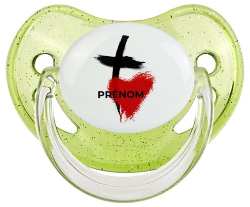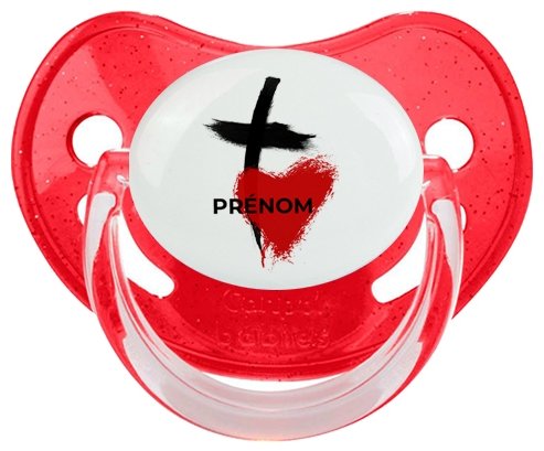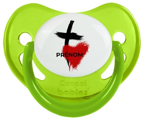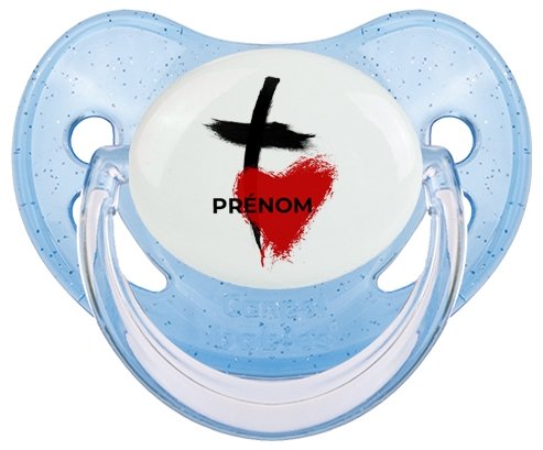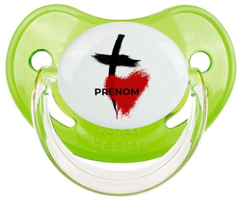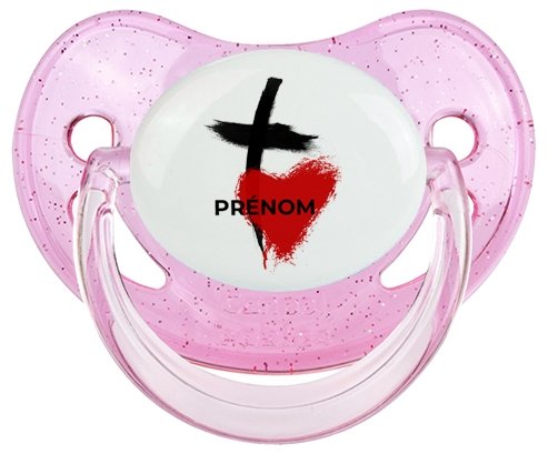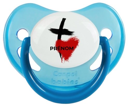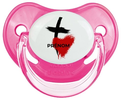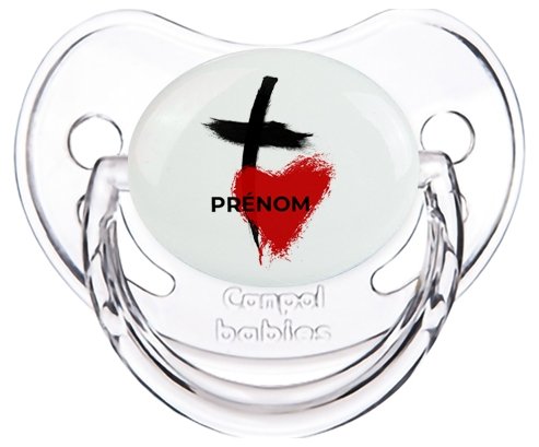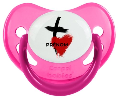Sucette personnalisée pour bébé avec le design : Croix + cœur avec prénom Sucette Physiologique en silicone de la marque Canpol Babies avec impression en couleur.un cadeau idéal pour vos bébés. Nos sucettes sont conçues avec l'aide de pédiatres et de dentistes pour respecter la physiologie de bébé et répondre à son réflexe naturel de succion.
