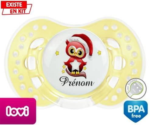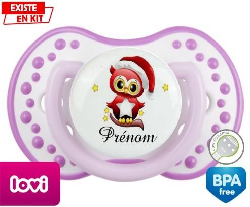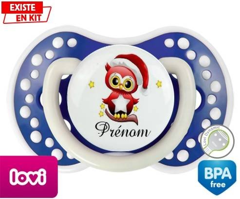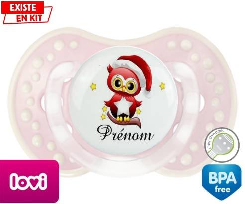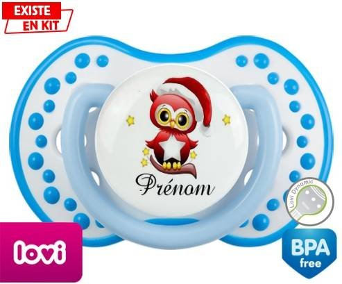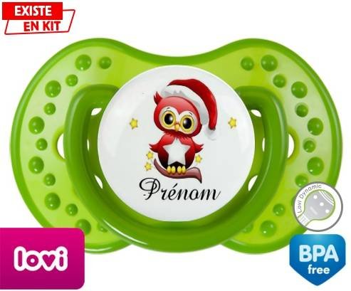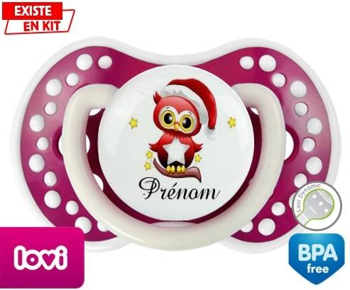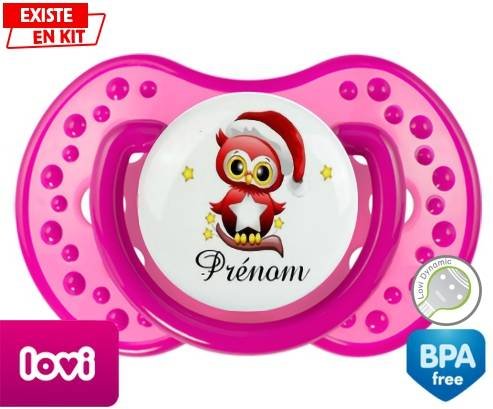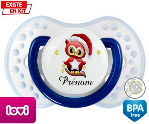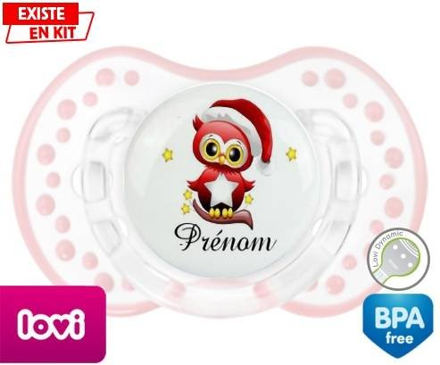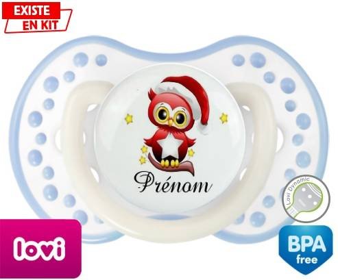 Tetine personnalisee pour bébé Hibou de noël + prénom à embout LOVI Dynamic en silicone de la marque Lovi Dynamic avec impression en en Couleurs de la collection Prénom personnalisé.La silicone se reconnaît par sa couleur transparente. C'est une matière souple, douce, sans goût ni odeur et offre à bébé une succion plus facile grâce à sa souplesse.