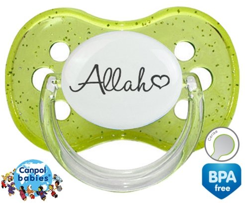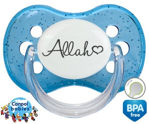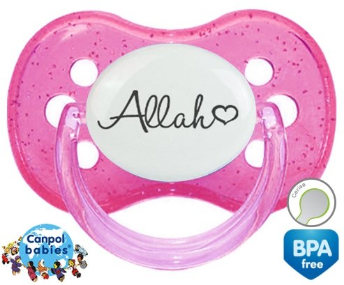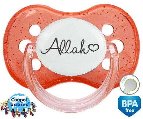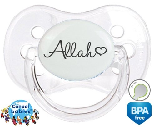 Sucette personnalisée pour bébé Love allah à embout Cerise en silicone de la marque Canpol Babies avec impression en en Gris de la collection Religion / Croyance.La silicone se reconnaît par sa couleur transparente. C'est une matière souple, douce, sans goût ni odeur et offre à bébé une succion plus facile grâce à sa souplesse.