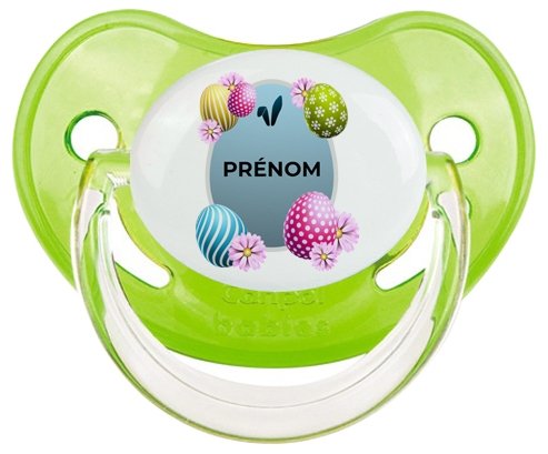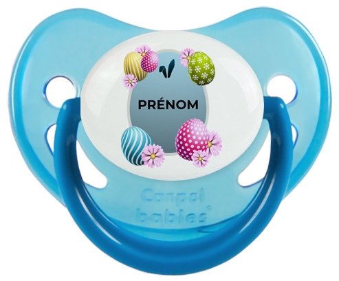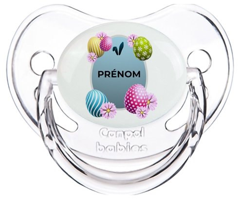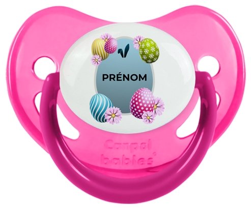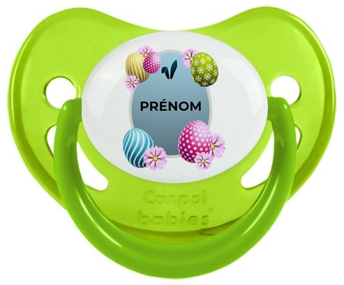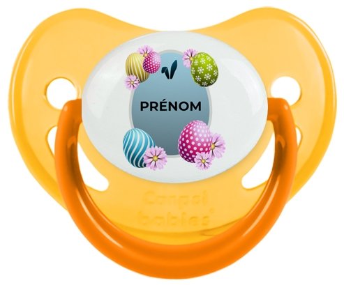 Sucette personnalisée pour bébé design : Oeuf de Pâques design-12 avec prénom Sucette Physiologique en silicone de la marque Canpol Babies avec impression en couleur.un cadeau idéal pour vos bébés. Nos sucettes sont conçues avec l'aide de pédiatres et de dentistes pour respecter la physiologie de bébé et répondre à son réflexe naturel de succion.