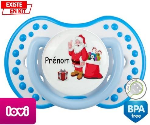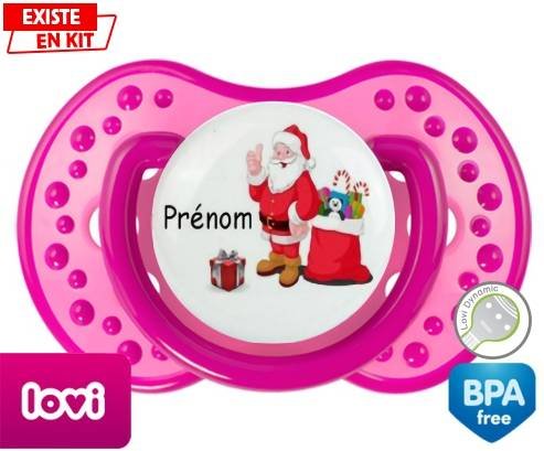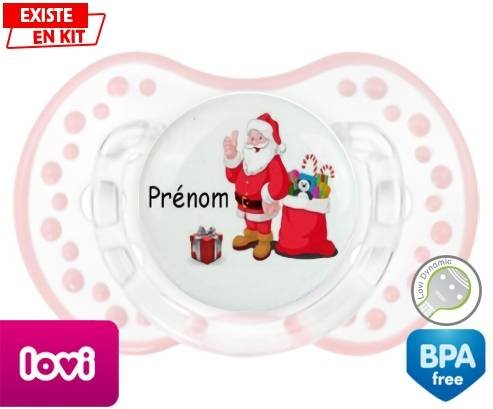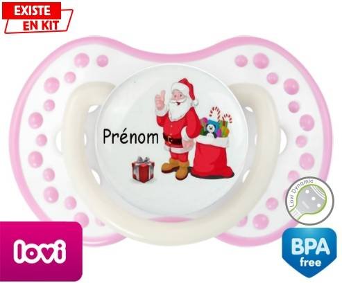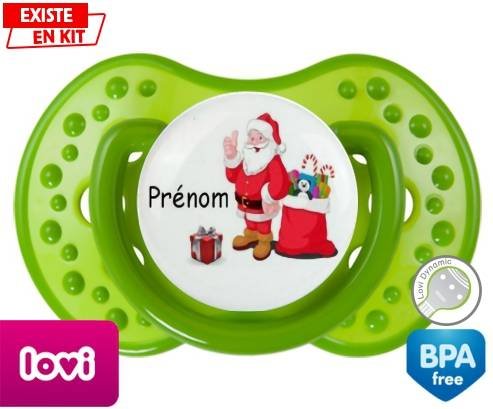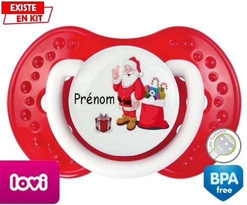 Tétine personnalisée pour bébé Père noël et cadeau + prénom à embout LOVI Dynamic en silicone de la marque Lovi Dynamic avec impression en en Couleurs de la collection Prénom personnalisé.La silicone se reconnaît par sa couleur transparente. C'est une matière souple, douce, sans goût ni odeur et offre à bébé une succion plus facile grâce à sa souplesse.
