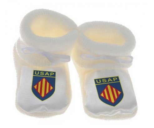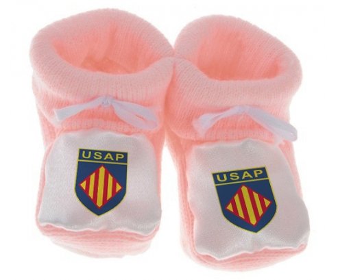 Su7.fr vous propose le chausson bébé personnalisé pour nouveau né avec le design : USA Perpignan . Ce chausson avec une impression en couleur compléte toute la gamme ( sucette, attache-sucette, bavoir, chausson, body , Boîte à sucette, et bonnet).