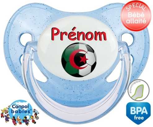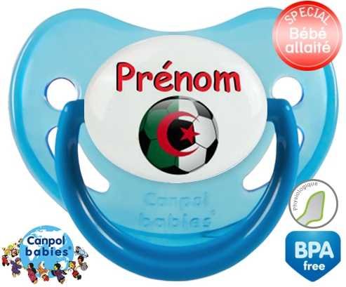 Tetine personnalisee pour bébé Ballon foot Algérie + prénom à embout Physiologique en silicone de la marque Canpol Babies avec impression en en Couleurs de la collection Prénom personnalisé.La silicone se reconnaît par sa couleur transparente. C'est une matière souple, douce, sans goût ni odeur et offre à bébé une succion plus facile grâce à sa souplesse.