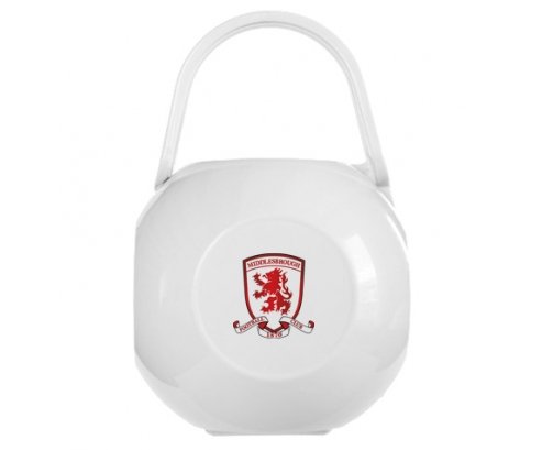 Boite à sucette avec design : Middlesbrough Football Club , impression de qualité et en couleur. Pratique : elle transporte la sucette en tout lieu. Grâce à sa poignée souple, elle est facile à accrocher à la poussette, sac à langer ... Cette boîte de rangement flexible, est la solution hygiénique pour protéger les sucettes de son enfant quand il ne les utilise pas. Peut contenir jusqu'à deux sucettes.