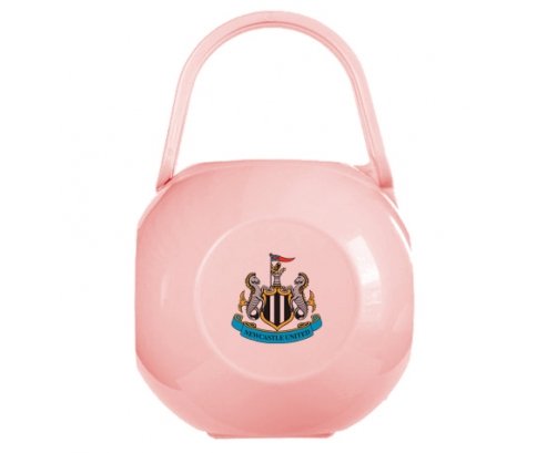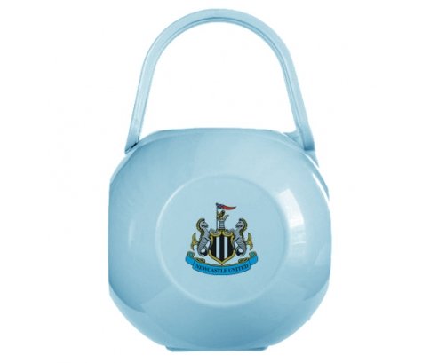 Boite à sucette personnalisée : Newcastle United Football Club , avec une impression en couleur et qui compléte toute la gamme ( sucette, attache-sucette, bavoir, chausson, body et bonnet).