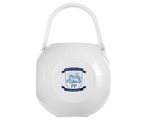 Boite à tetine personnalisée : Preston North End Football Club , avec une impression en couleur et qui compléte toute la gamme ( tetine, attache-tetine, bavoir, chausson, body et bonnet).