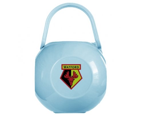Boîte à sucette personnalisée : Watford Football Club , avec une impression en couleur et qui compléte toute la gamme ( sucette, attache-sucette, bavoir, chausson, body et bonnet).