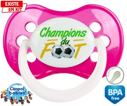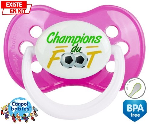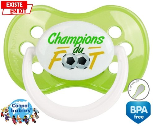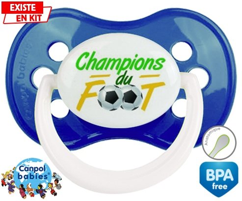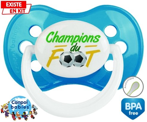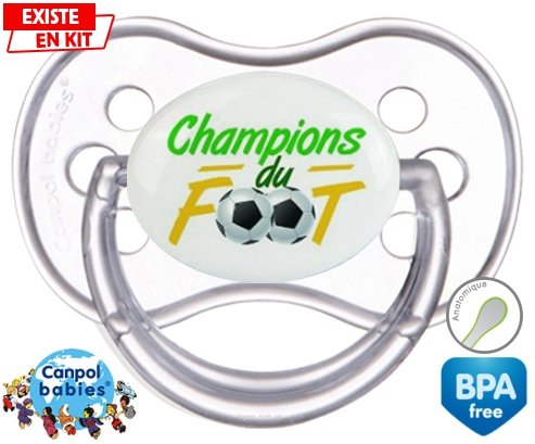 Sucette personnalisée pour bébé Champion du foot à embout Anatomique en silicone de la marque Canpol Babies avec impression en en Couleurs de la collection Sport / Loisir.La silicone se reconnaît par sa couleur transparente. C'est une matière souple, douce, sans goût ni odeur et offre à bébé une succion plus facile grâce à sa souplesse.