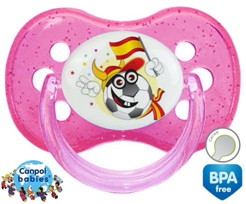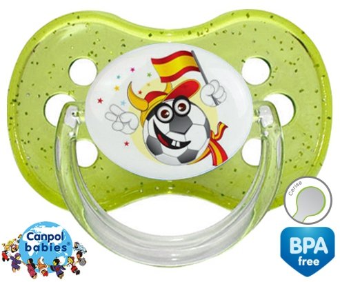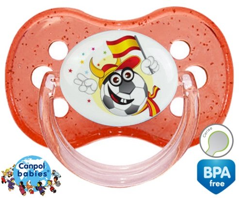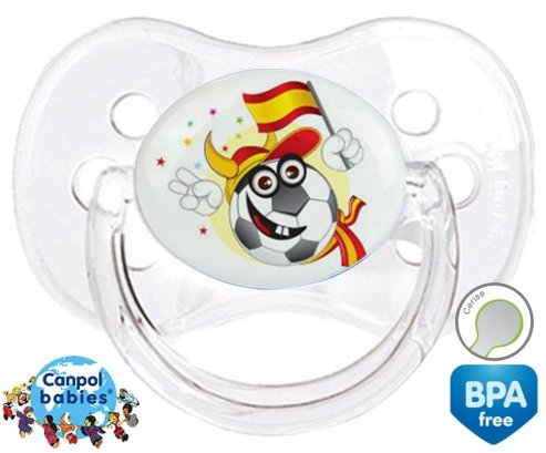 Tetine personnalisee pour bébé Euro 2016 espagne à embout Cerise en silicone de la marque Canpol Babies avec impression en en Couleurs de la collection Sport / Loisir.La silicone se reconnaît par sa couleur transparente. C'est une matière souple, douce, sans goût ni odeur et offre à bébé une succion plus facile grâce à sa souplesse.
