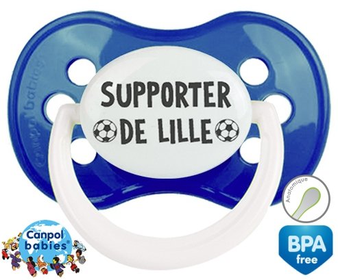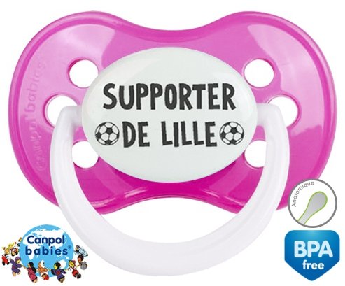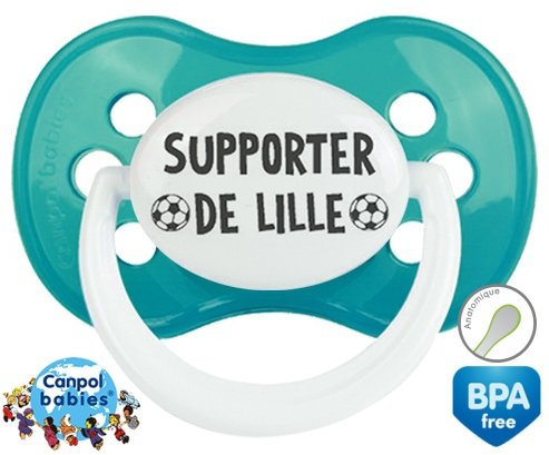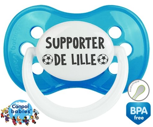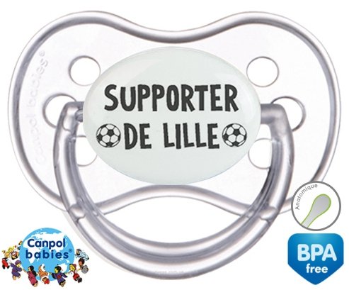 Sucette personnalisée pour bébé Foot supporter lille à embout Anatomique en silicone de la marque Canpol Babies avec impression en en Gris de la collection Sport / Loisir.La silicone se reconnaît par sa couleur transparente. C'est une matière souple, douce, sans goût ni odeur et offre à bébé une succion plus facile grâce à sa souplesse.