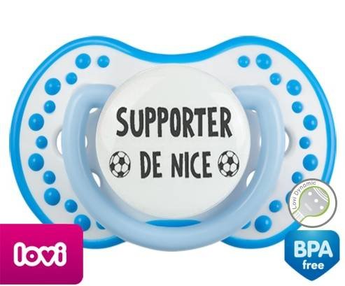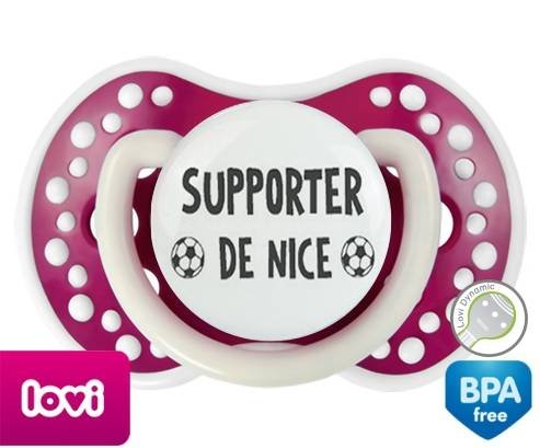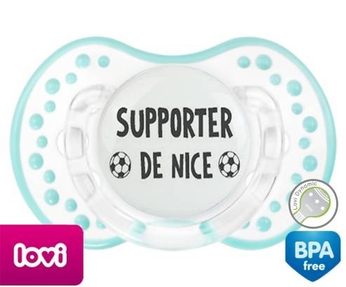 Tétine personnalisée pour bébé Foot supporter nice à embout LOVI Dynamic en silicone de la marque Lovi Dynamic avec impression en en Gris de la collection Sport / Loisir.La silicone se reconnaît par sa couleur transparente. C'est une matière souple, douce, sans goût ni odeur et offre à bébé une succion plus facile grâce à sa souplesse.