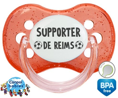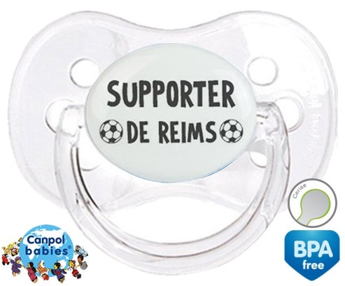 Sucette personnalisée pour bébé Foot supporter reims à embout Cerise en silicone de la marque Canpol Babies avec impression en en Gris de la collection Sport / Loisir.La silicone se reconnaît par sa couleur transparente. C'est une matière souple, douce, sans goût ni odeur et offre à bébé une succion plus facile grâce à sa souplesse.