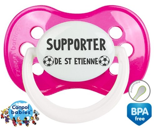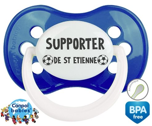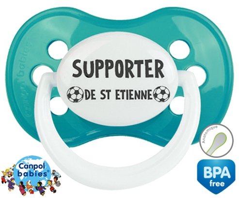 Sucette personnalisée pour bébé Foot supporter st etienne à embout Anatomique en silicone de la marque Canpol Babies avec impression en en Gris de la collection Sport / Loisir.La silicone se reconnaît par sa couleur transparente. C'est une matière souple, douce, sans goût ni odeur et offre à bébé une succion plus facile grâce à sa souplesse.