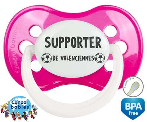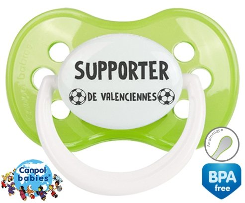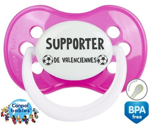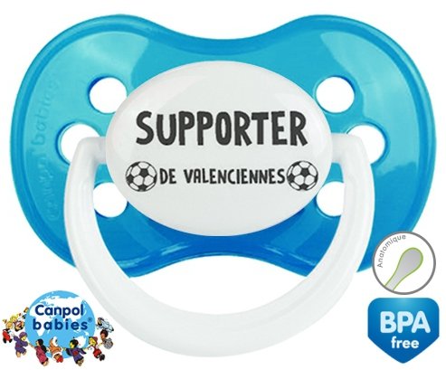 Sucette personnalisée pour bébé Foot supporter valenciennes à embout Anatomique en silicone de la marque Canpol Babies avec impression en en Gris de la collection Sport / Loisir.La silicone se reconnaît par sa couleur transparente. C'est une matière souple, douce, sans goût ni odeur et offre à bébé une succion plus facile grâce à sa souplesse.