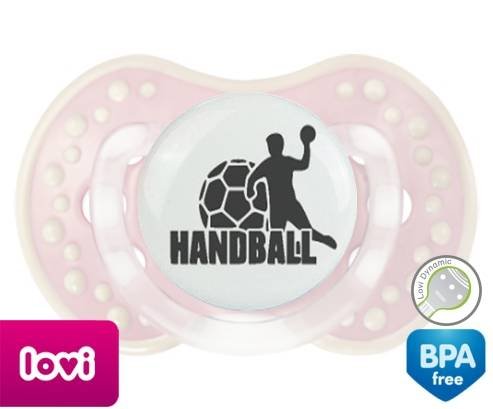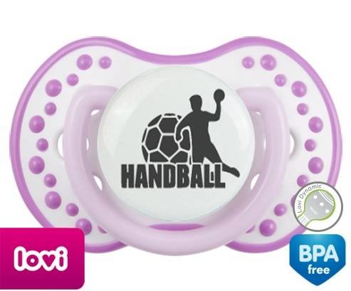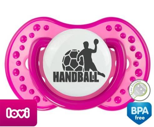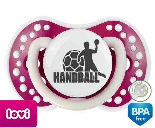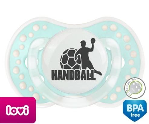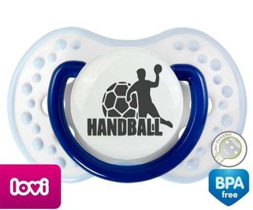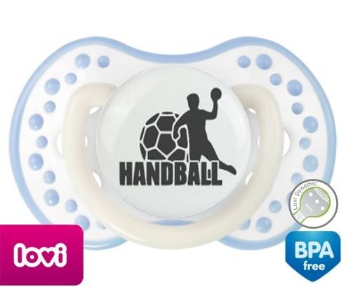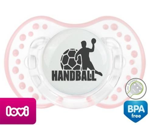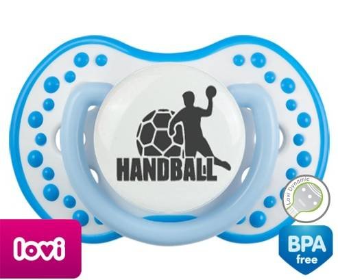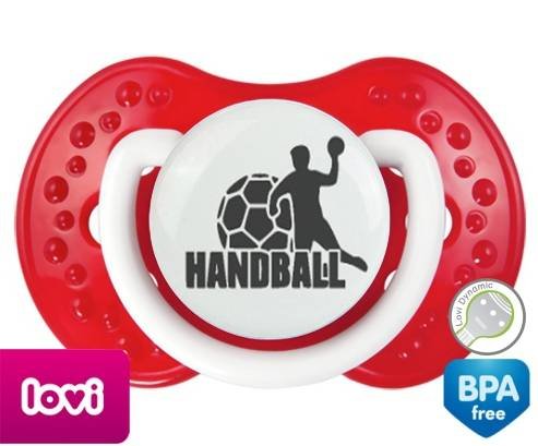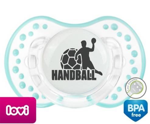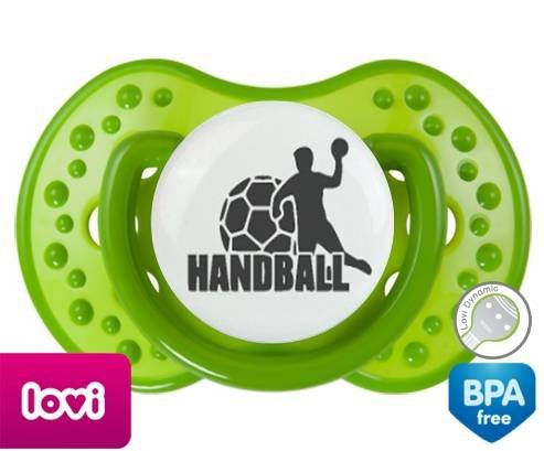 Tetine personnalisee pour bébé Handball à embout LOVI Dynamic en silicone de la marque Lovi Dynamic avec impression en en Gris de la collection Sport / Loisir.La silicone se reconnaît par sa couleur transparente. C'est une matière souple, douce, sans goût ni odeur et offre à bébé une succion plus facile grâce à sa souplesse.