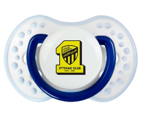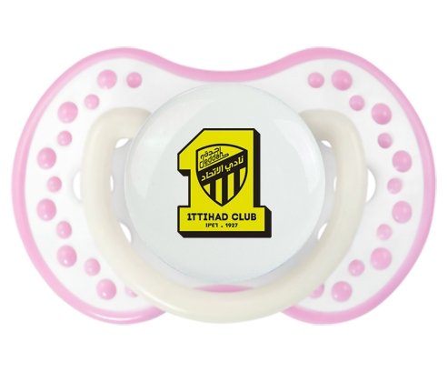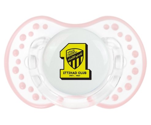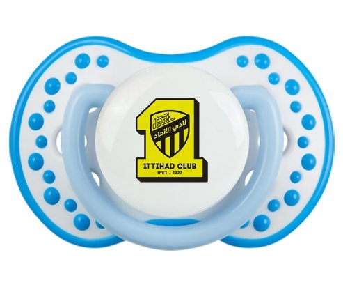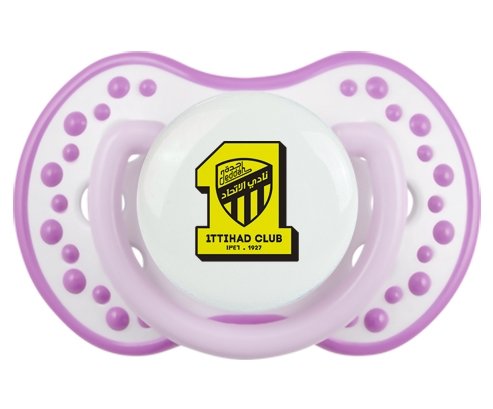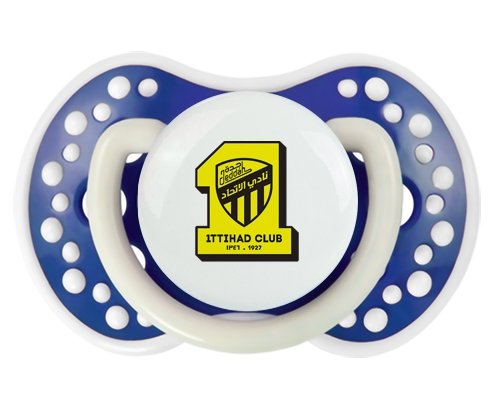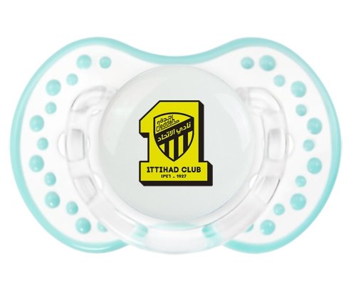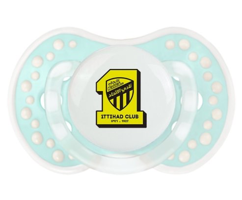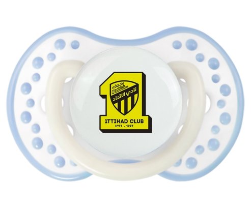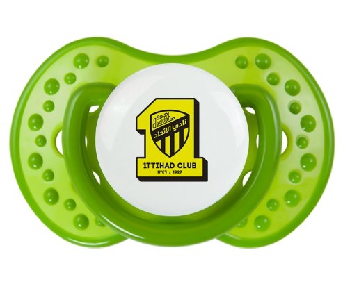 Sucette personnalisée pour bébé Ittihad FC Saudi Arabia à embout LOVI Dynamic en silicone de la marque Lovi Dynamic avec impression en en Couleurs de la Collection Pays / Équipes .La silicone se reconnaît par sa couleur transparente. C'est une matière souple, douce, sans goût ni odeur et offre à bébé une succion plus facile grâce à sa souplesse.