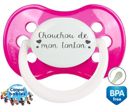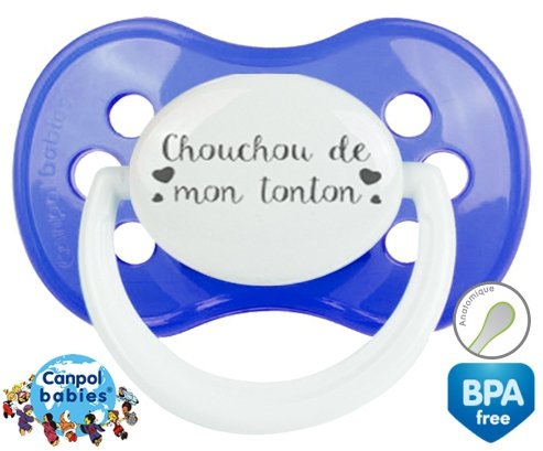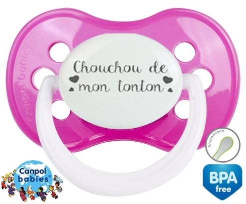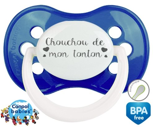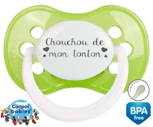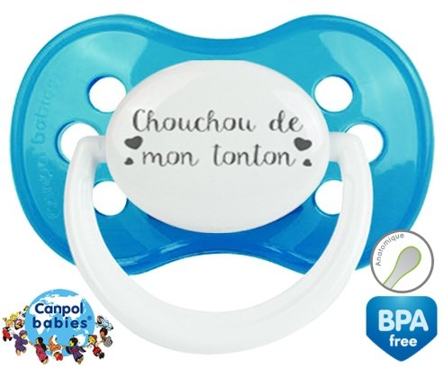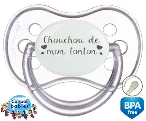 Sucette personnalisée pour bébé Chouchou de mon tonton à embout Anatomique en silicone de la marque Canpol Babies avec impression en en Gris de la collection Tonton / Tata.La silicone se reconnaît par sa couleur transparente. C'est une matière souple, douce, sans goût ni odeur et offre à bébé une succion plus facile grâce à sa souplesse.