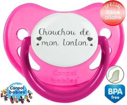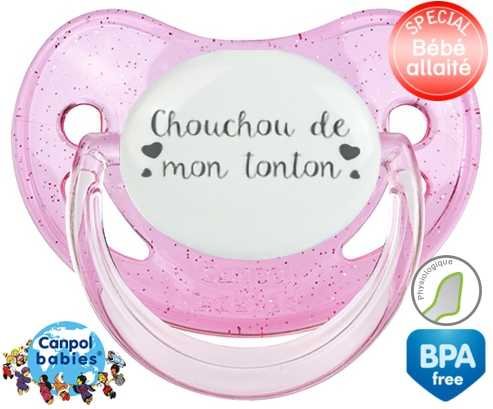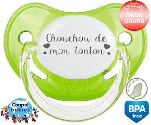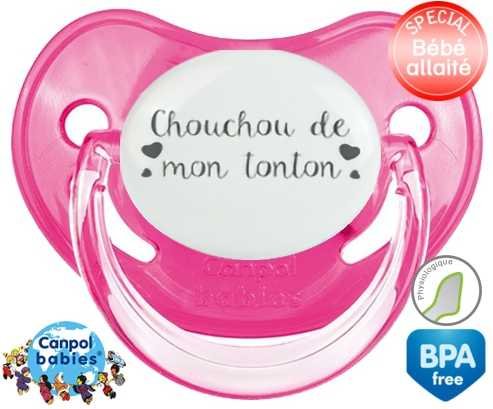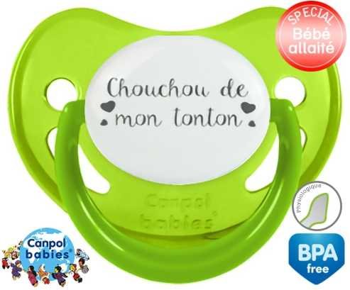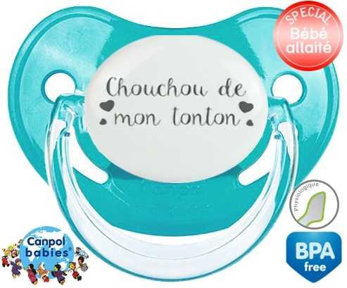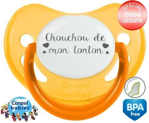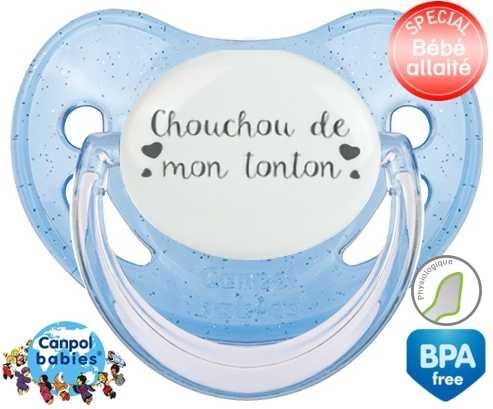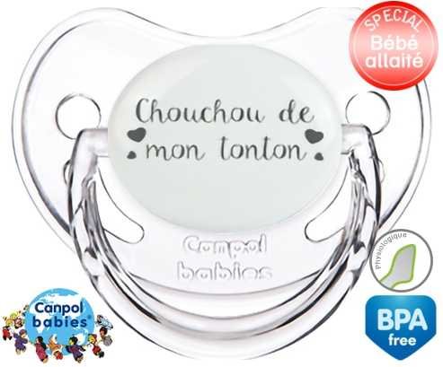 Tetine personnalisee pour bébé Chouchou de mon tonton à embout Physiologique en silicone de la marque Canpol Babies avec impression en en Gris de la collection Tonton / Tata.La silicone se reconnaît par sa couleur transparente. C'est une matière souple, douce, sans goût ni odeur et offre à bébé une succion plus facile grâce à sa souplesse.