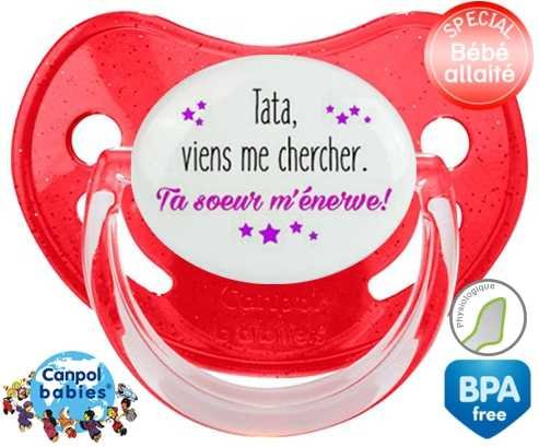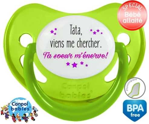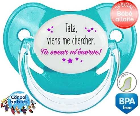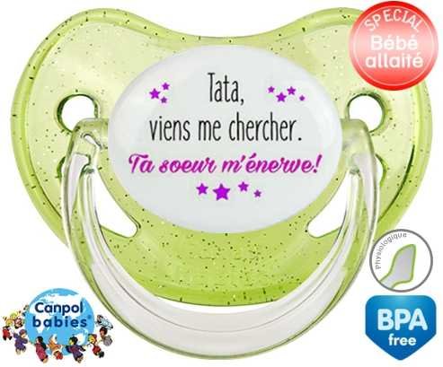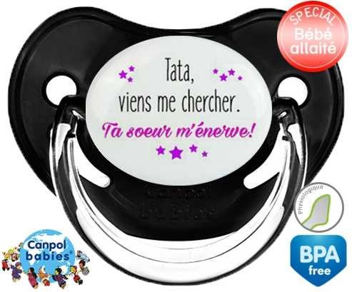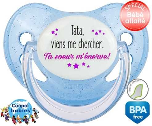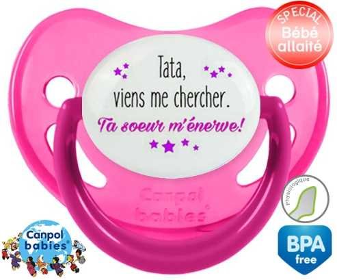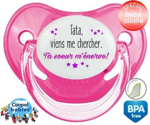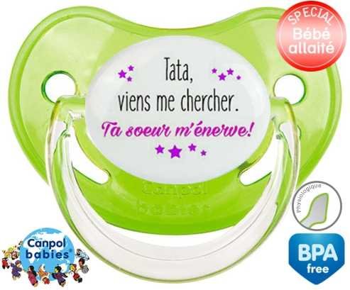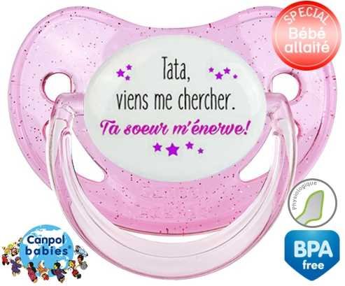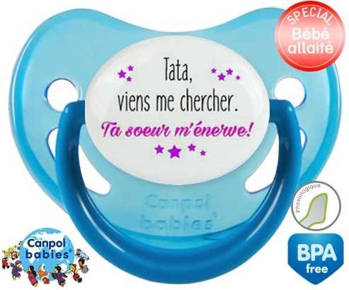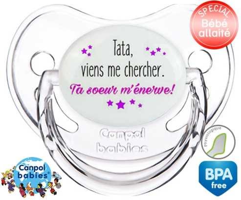 Sucette personnalisée pour bébé Tata viens me chercher... à embout Physiologique en silicone de la marque Canpol Babies avec impression en en Couleurs de la collection Tonton / Tata.La silicone se reconnaît par sa couleur transparente. C'est une matière souple, douce, sans goût ni odeur et offre à bébé une succion plus facile grâce à sa souplesse.